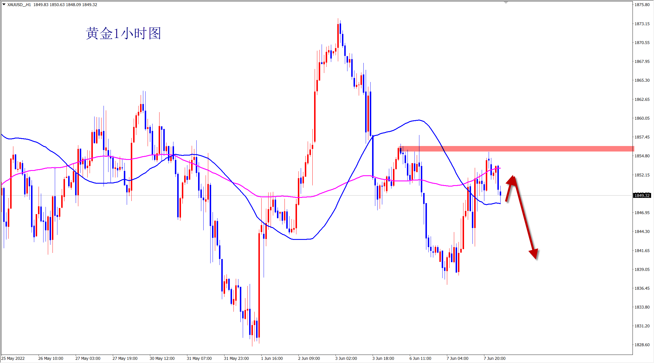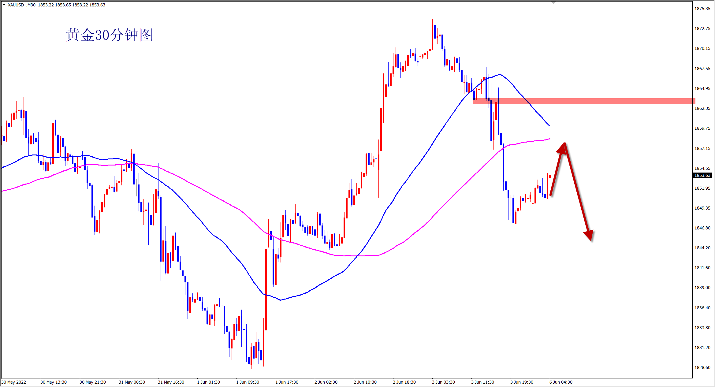 黄金昨日震荡后下跌,我们1856和1853的空分别下跌拿下利润。当前跌势不变,早盘反弹还是继续空,依托1848压力干空! 黄金当前明显的下跌走势,下周四是美联储利率决议,预计会继续加息50基点,对于黄金属于利空!而当前的走势也是空头!早盘依托1848的压力反弹继续干空,黄金调整后还会继续下跌。 震荡下跌,