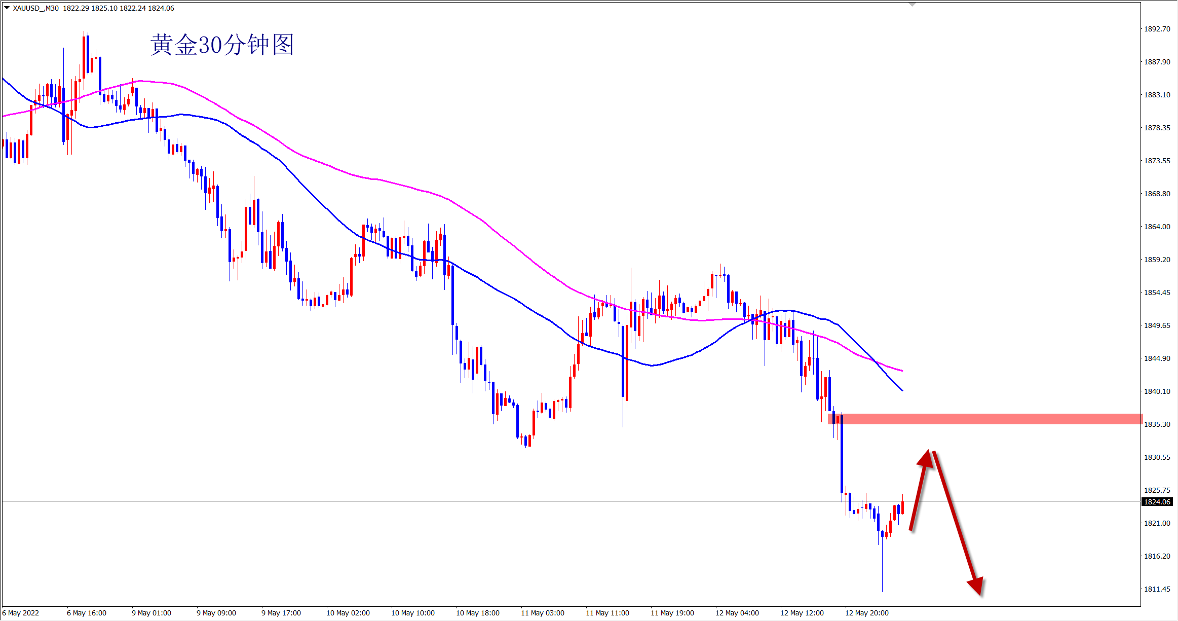 黄金昨日先涨后跌,最终多头还是遇阻后回落,上涨力度不强,空头继续!今日依托1825的压力干空! 黄金最近一直是空头走势,每次看似强势的反弹,最终都是一波结束,遇阻后再次阴跌不止,甚至会破位新低。昨日遇阻后行情再次开启下跌,而且没有反弹,又是阴跌走势!当前只能继续顺势干空,多头无力,继续下探1800!