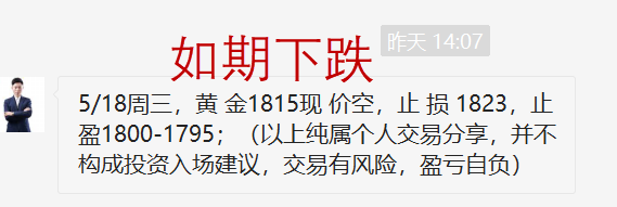 黄金昨日波动不大,但我们1815的空还是如期下跌至1808一线收割,随后的反弹也没有突破1825的压力,还是空头下跌,今日依托1825的压力继续干空! 黄金当前还是空头下跌趋势,虽然短线行情有震荡,但是反弹力度不足!和此前的走势一样,每次看似强势的反弹,但遇阻后最终还是阴跌不止,最后破位新低!当前的黄金