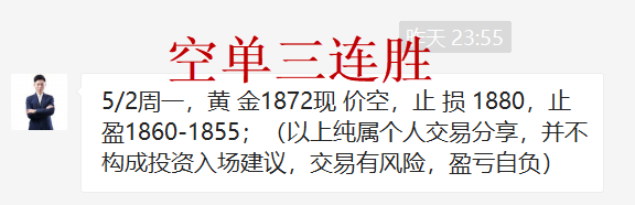 黄金昨日大跌,我们从1887开始,1882接力空,美盘1872再次空,如期下跌获利,周初直接拿下三连胜,开门红,非常给力!顺势轻飘飘,逆势乱糟糟,今日1875压力下继续干空! 黄金当前毫无疑问,明显的跌势,顺势为王,是我们一直的原则!记住顺势操作!交易不可能每一笔都尽心如意,记住一点,顺势,克服自己抄底