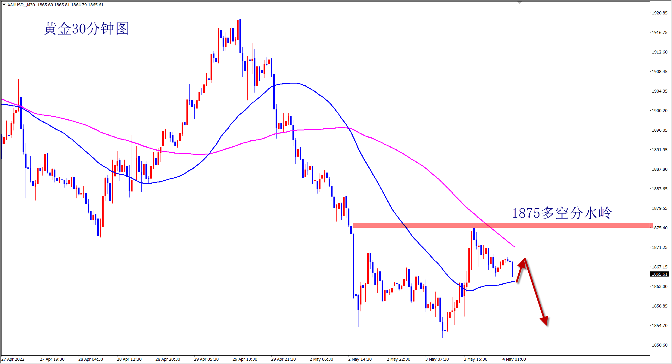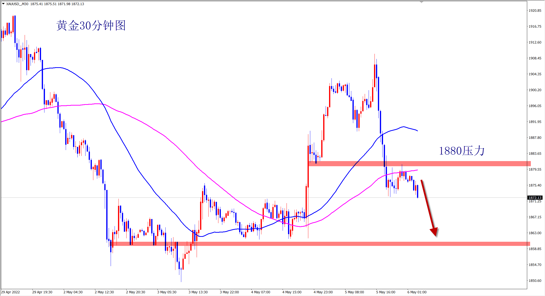 黄金昨日大跌,今日早盘先跌后反弹,但没有突破我们所强调的1880的压力,反弹无力,依旧是空头走势,欧盘依旧是以1880的压力位防守看跌! 计划你的交易,交易你的计划。当前的黄金走势明确,就是下跌空头,反弹就是干空机会!昨日美盘冲高回落,直接下跌40美金,而且没有大的反弹,说明空头下跌非常强势,千万不要