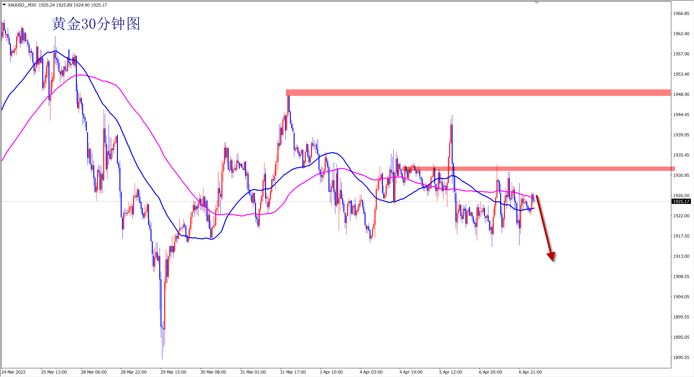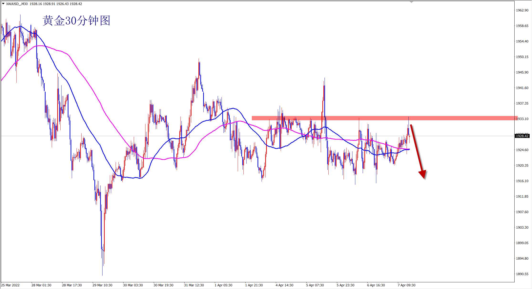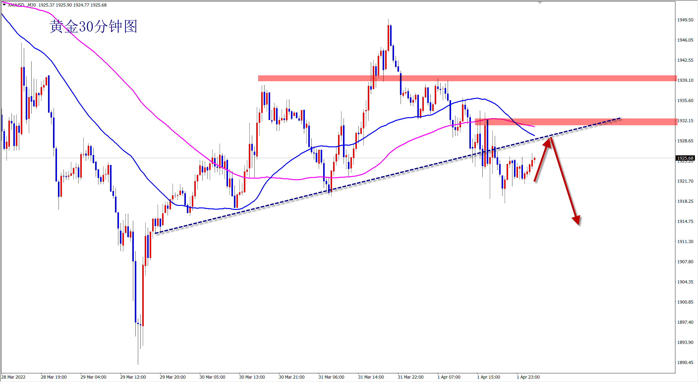 黄金周五跌破支撑开始下跌,我们也顺势1930和1926空拿下两连胜,今日黄金还是跌势不变,早盘1934压力下继续干空! 黄金当前已经跌破此前的低点连线的支撑,破位后多空转换,支撑变压力!而且周五的美盘反弹一直承压1934,并且也是当前30分钟均线压力位置,多重压力合一,反弹后就要直接空,早盘1934压力下继续干空