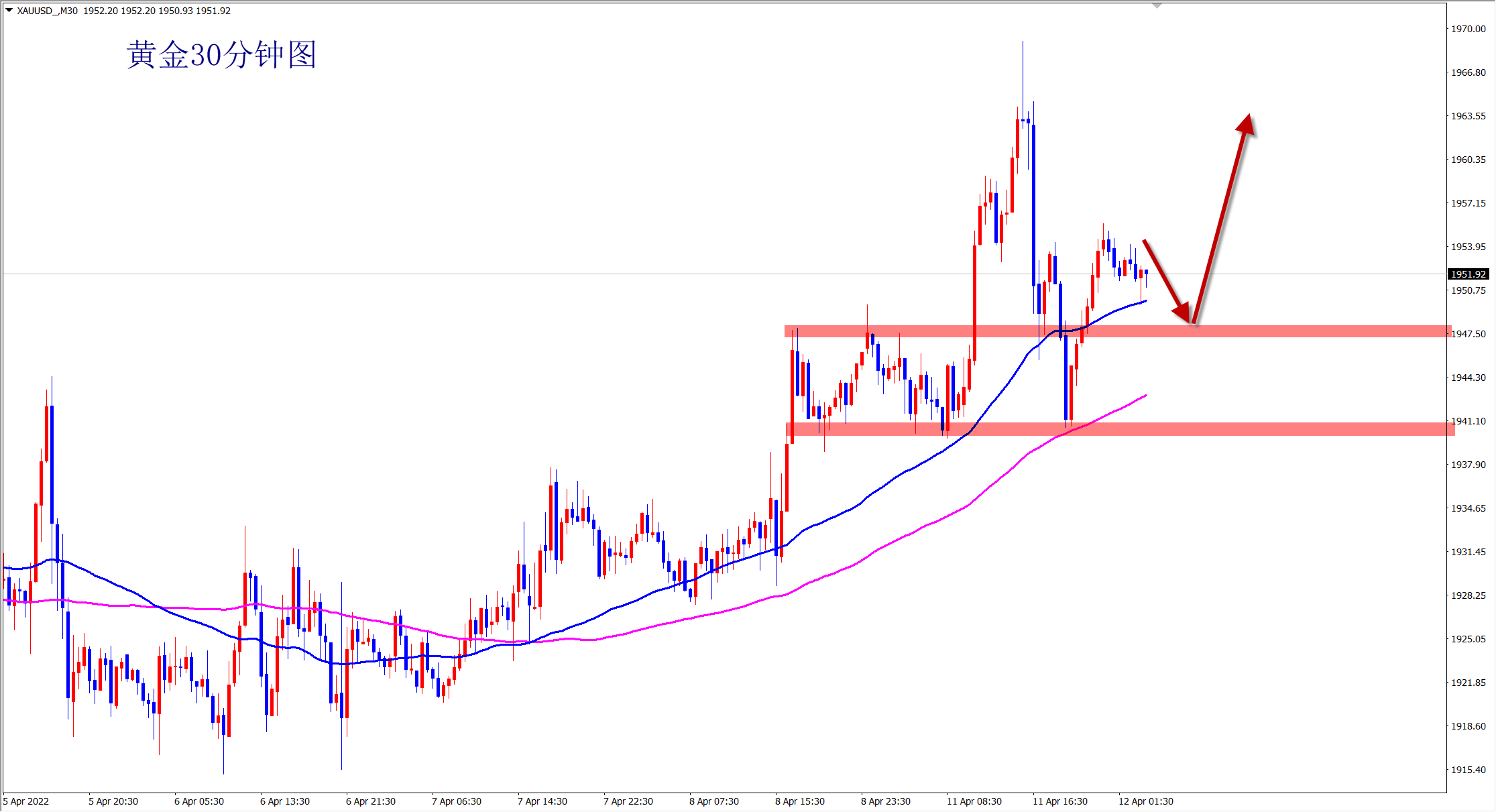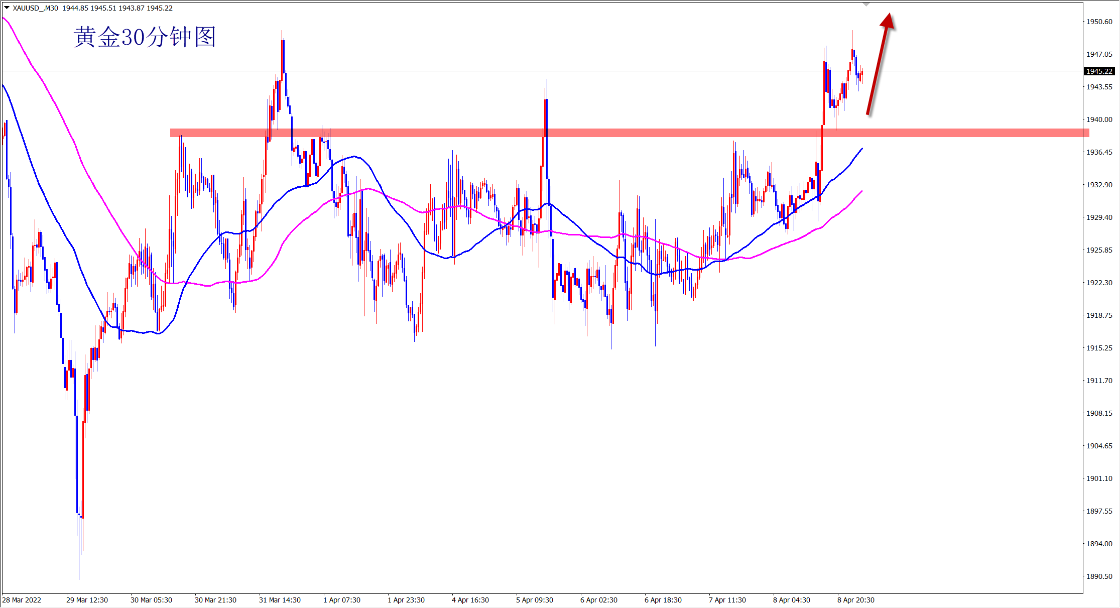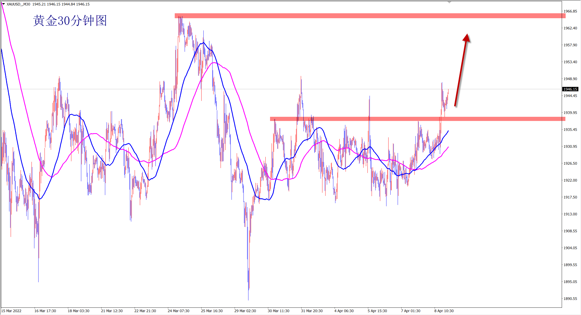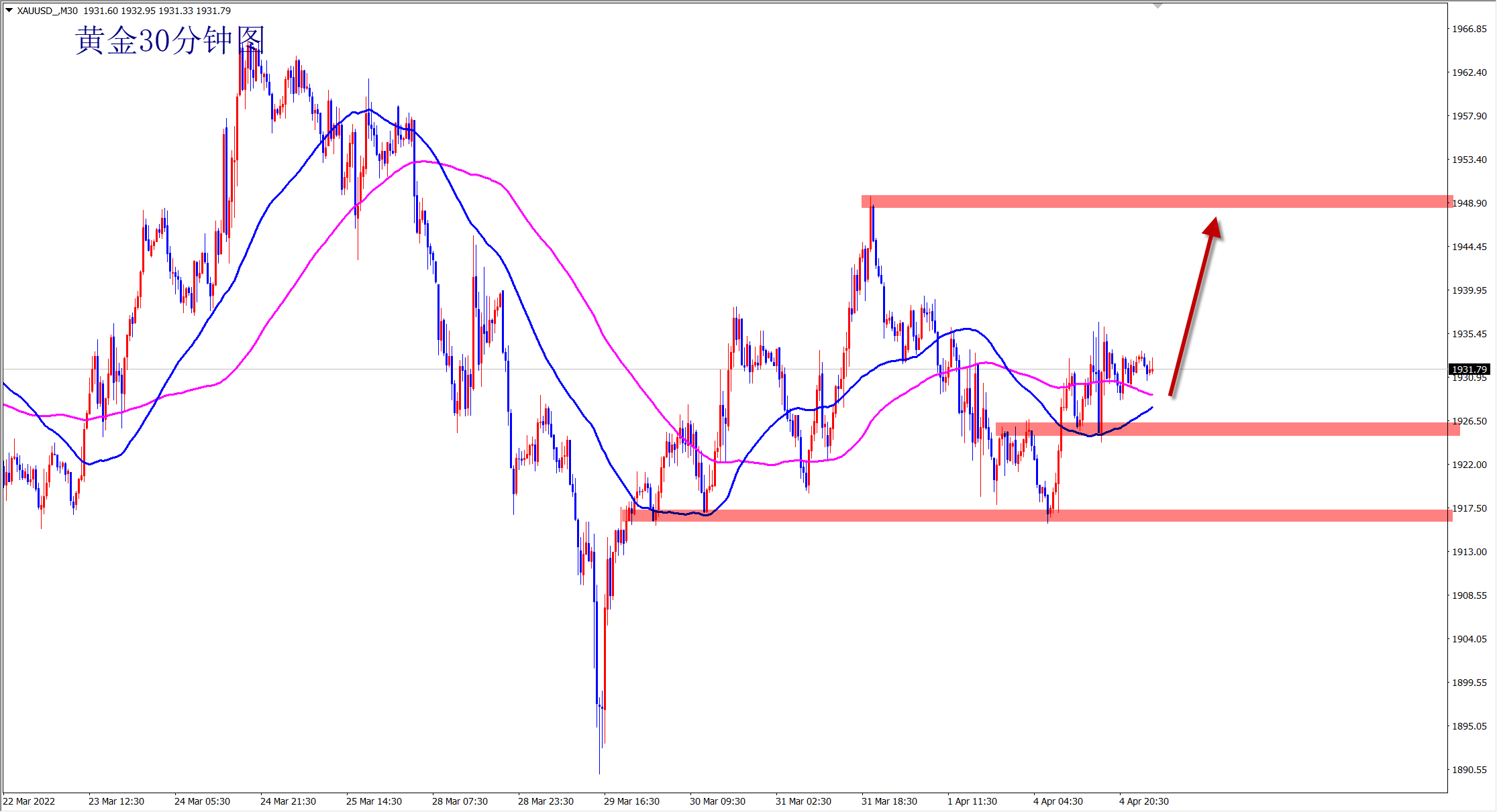 黄金昨日上涨遇阻回落,但站稳在1940盘整支撑上方,随后深V反弹,维持多头走势,早盘1942上继续干多! 黄金30分钟级别上明显的上涨走势,而且受到均线的支撑,昨日虽然深度回调,但依旧是维持均线上方,还是多头走势没有改变!今日将依托长期均线的支撑,继续低多看涨!上方的压力还是昨日冲高的1970位置! 黄
