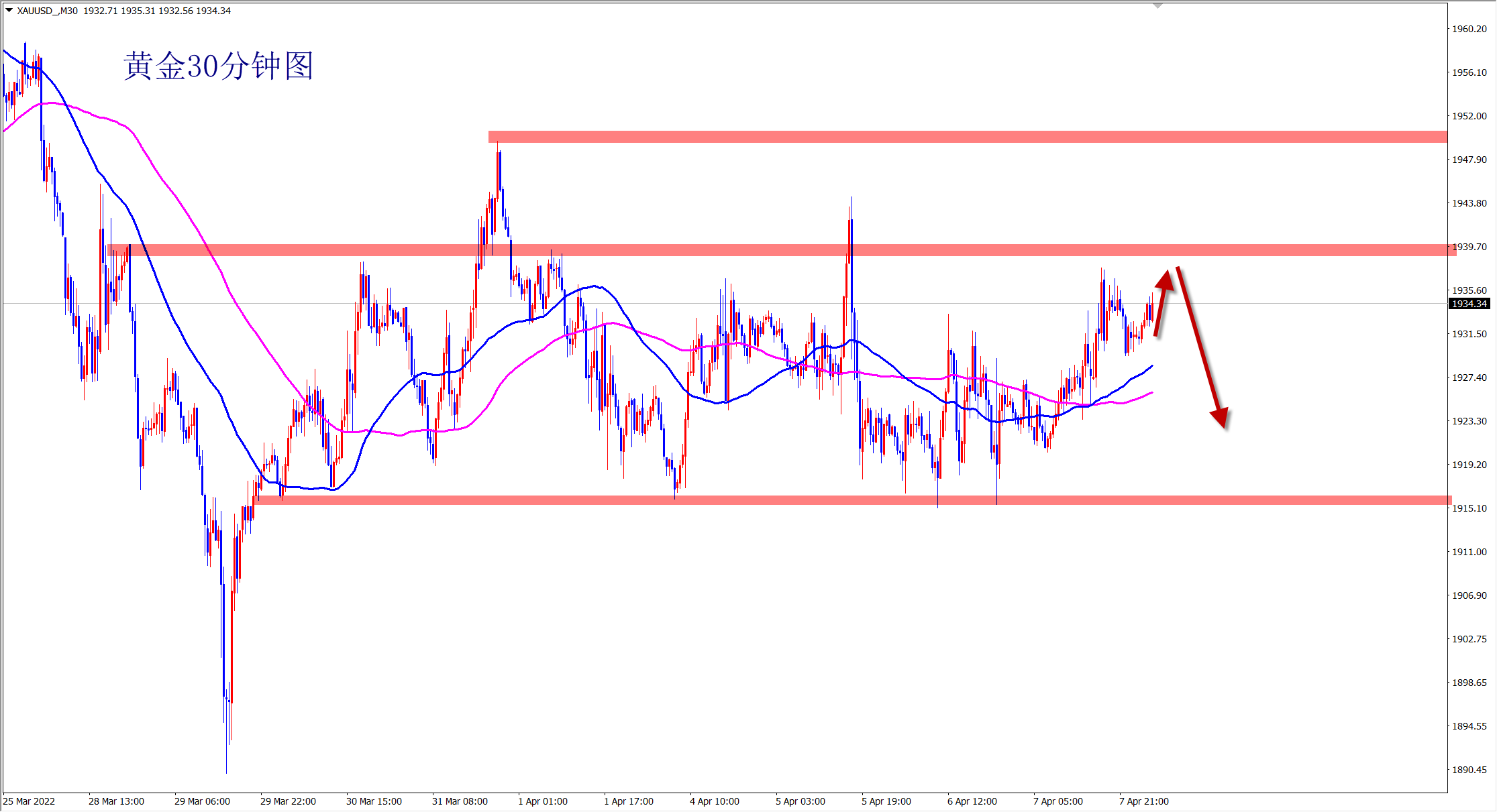 黄金当前还是区间内的震荡走势,涨跌不延续,没有突破前,还是继续按照震荡思路对待,高抛低吸,早盘依托1940的压力干空! 黄金当前区间内反复来回,大涨大跌都没有延续性,操作上不要轻易追多,而是压力支撑位置反向操作!昨日上涨遇阻前期盘整1937的压力后回落,早盘再次冲击后遇阻,压力位置先空! 早盘194