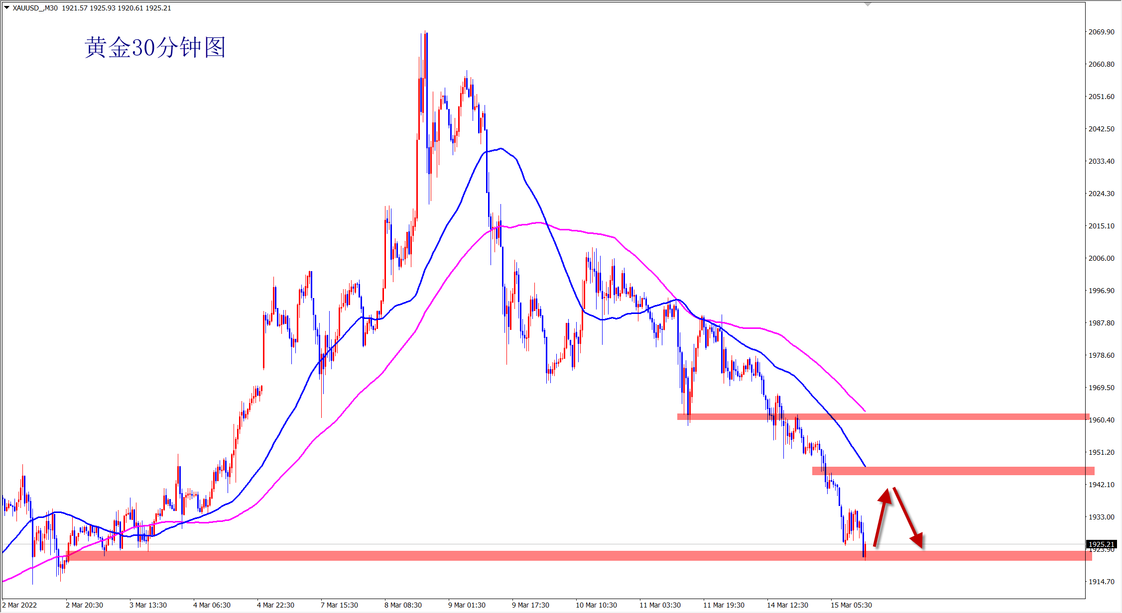 黄金今日再次单边阴跌,我们1945空如期大跌获利,空单已经八连胜到手!当前黄金跌至我们预期的1920目标位置,超跌后会有反弹,美盘短线看一波反弹后再空,依托1915支撑干多,涨至1940后再空! 涨跌有方向,市场有节奏,大涨后可以对应大跌,大跌后也可以来一波反弹!黄金从2070跌至当前已经150美金的大跌,超跌后必有