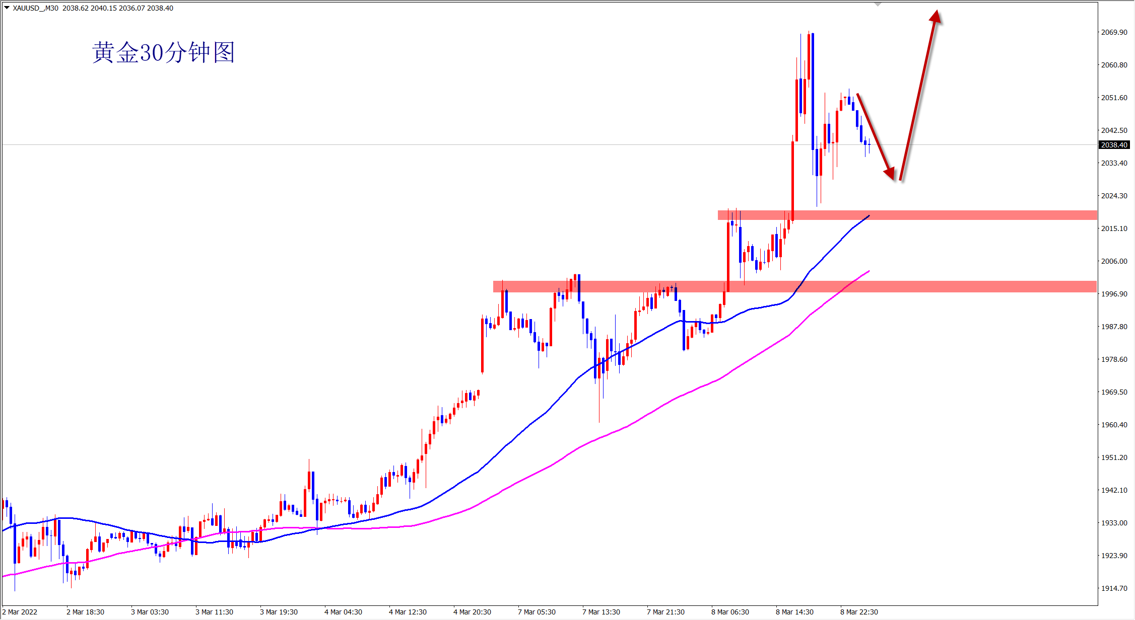 今日我们先是1980低多看涨如期大涨,随后欧盘俄乌谈判消息传来,没有实质性的进展,意味着冲突继续,黄金避险大涨拉升突破,涨势继续,美盘1988支撑上继续干多! 黄金此前大涨后大回落,今日在1970位置获得支撑后筑底反弹,再次卡其上涨走势,而且消息上也刺激黄金继续上行!并且突破了昨日2005的压力位置,黄金
