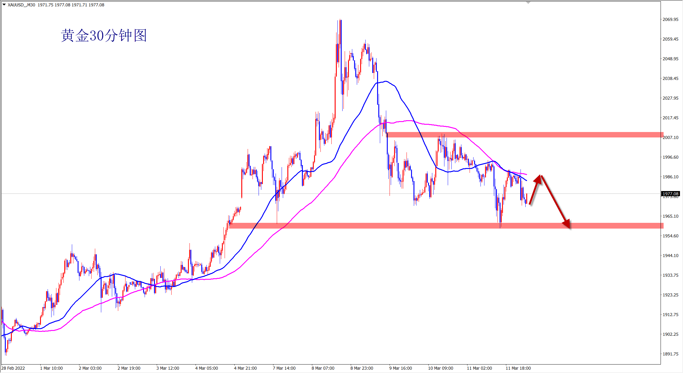 黄金上周五我们三次出手干空,全部斩获利润,当前黄金继续震荡,上方2008位置压力明显,反弹还是继续干空,早盘1990附近空! 黄金当前属于大跌后的震荡走势,上方2008压力明显,反弹多次遇阻,下方则是受到1960位置的支撑,周五下跌至1960后没有破位,随后V型反弹!当前黄金的走势还是受到俄乌局势的影响,今日还有视