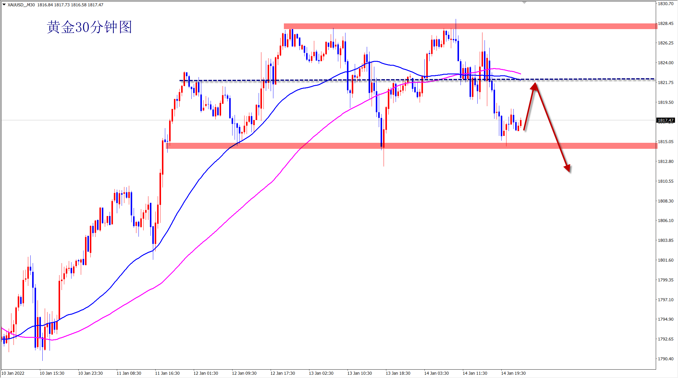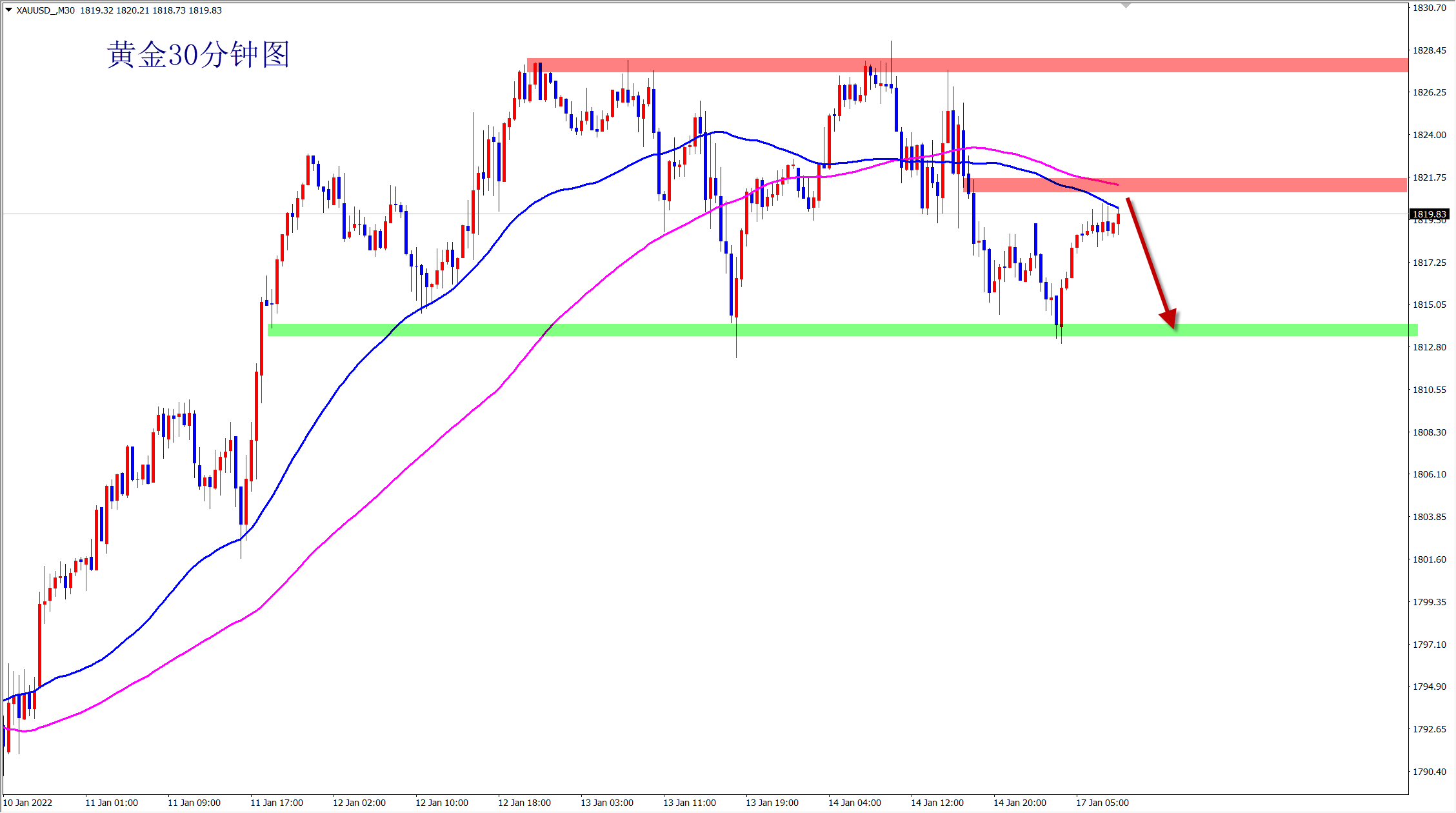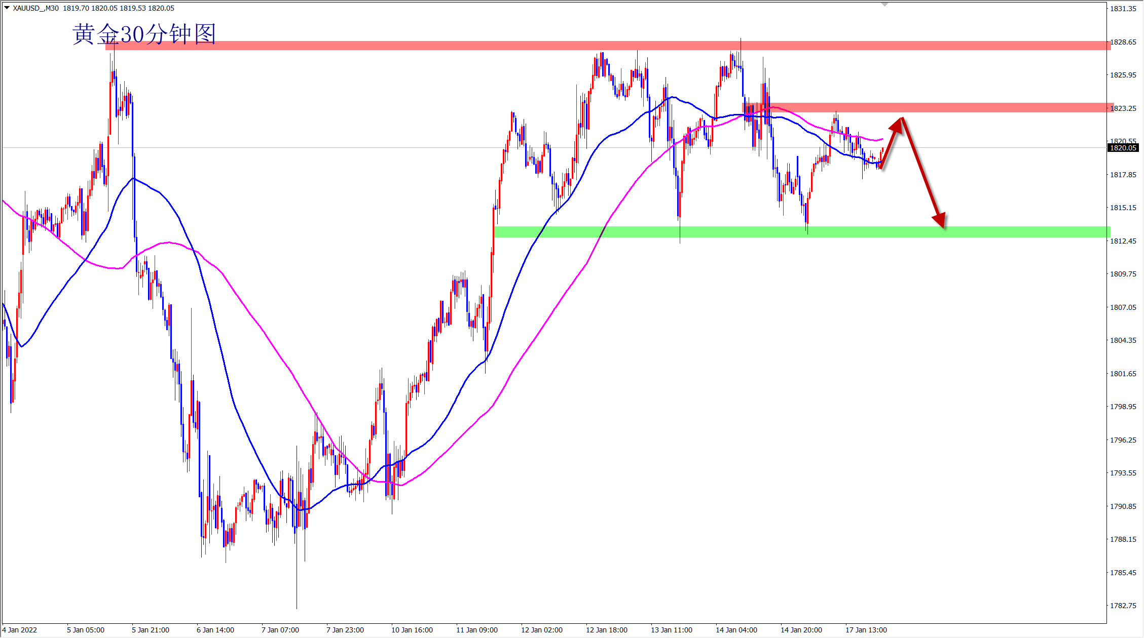 黄金早盘回落,但是在1813位置获得支撑,短线反弹,按照早盘思路,反弹1822压力附近可以继续干空!当前行情如期反弹,并触及压力区域,欧盘直接空! 黄金当前还是处于顶部震荡走势,但是高位压力难破,依旧是偏空头行情,当前反弹至30分钟均线压力位置,正是干空的点位,所以直接空,上方1830位置没有突破前,依旧是