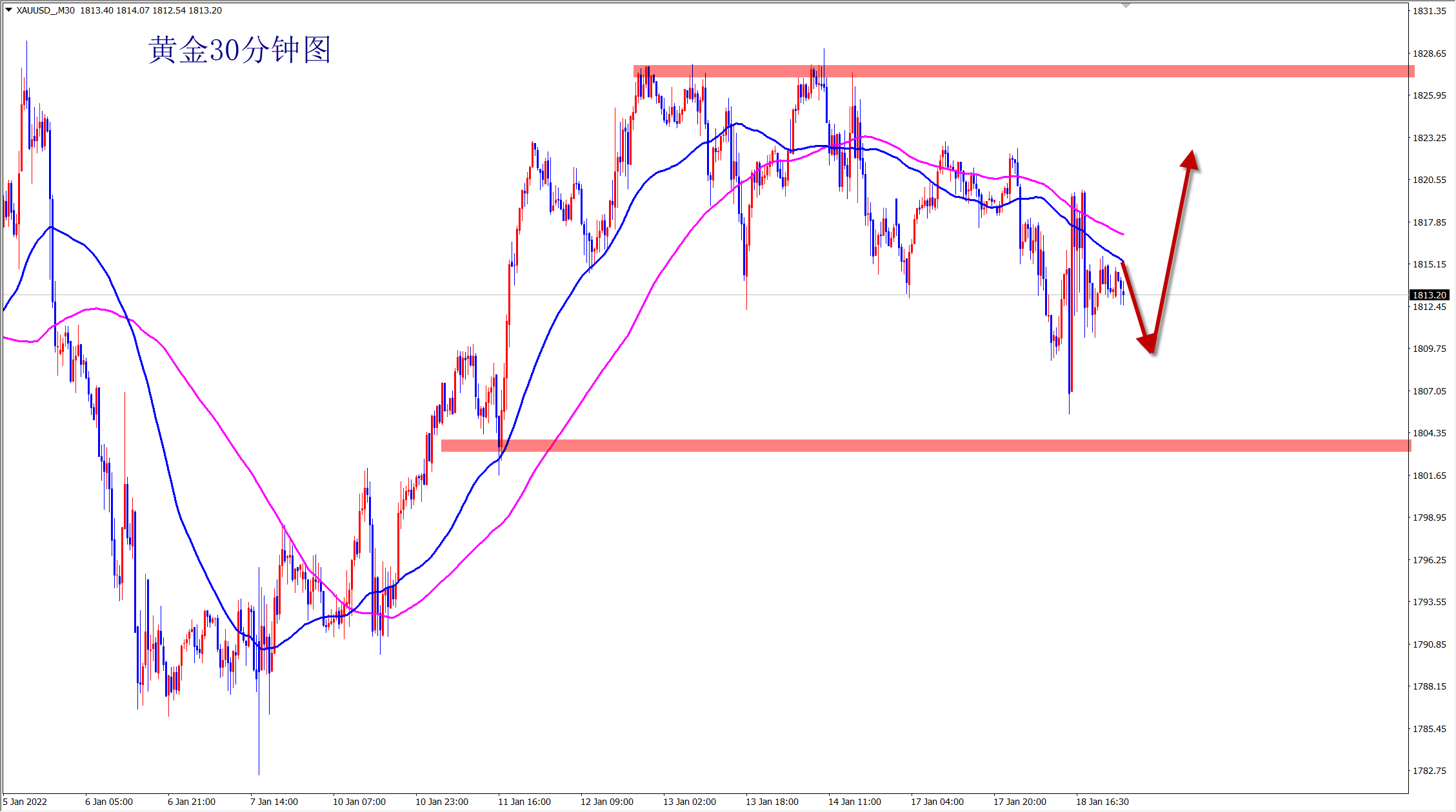 黄金昨日先跌后涨,整体还是震荡走势!当前属于1800-1830的宽幅震荡,区间内来回,早盘支撑位置先多看涨,上方遇阻后再空! 黄金整体上还是盘整的过程,昨日即便是破位后也没有加速,而且受到消息刺激后大阳,但是大阳后也是没有继续上涨,所以多空都缺乏延续性,还是震荡走势。任何的压力支撑位置都可能造成行情的翻