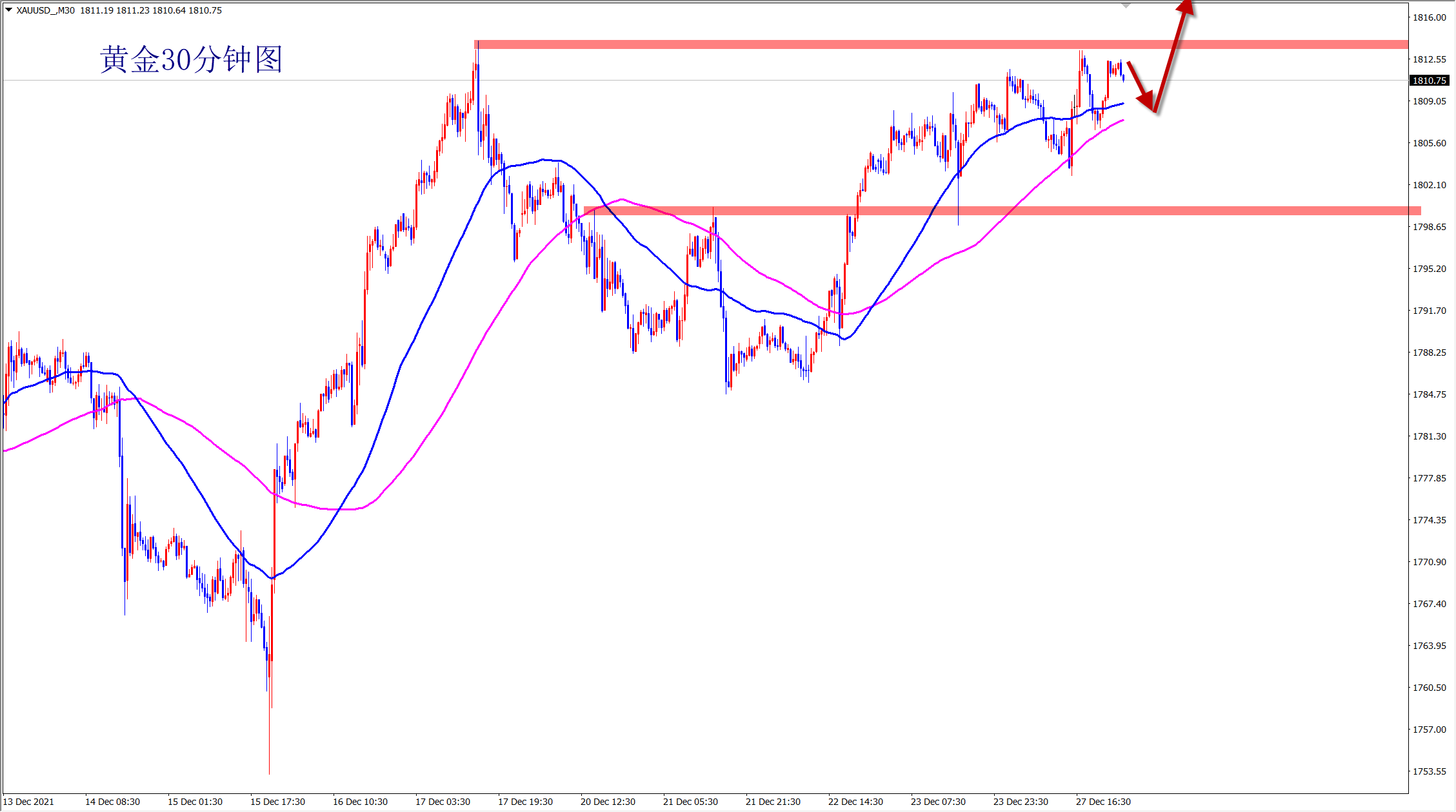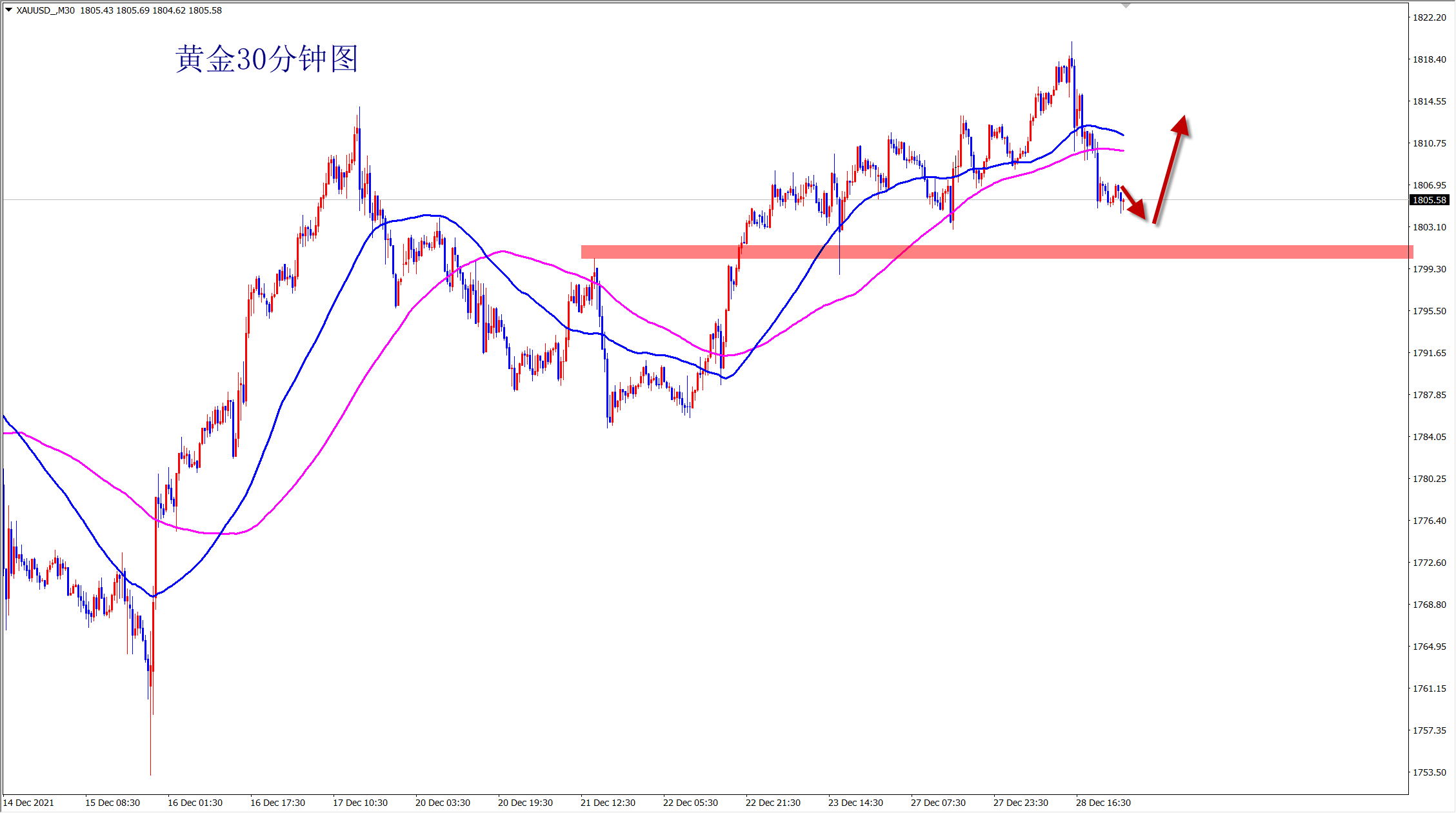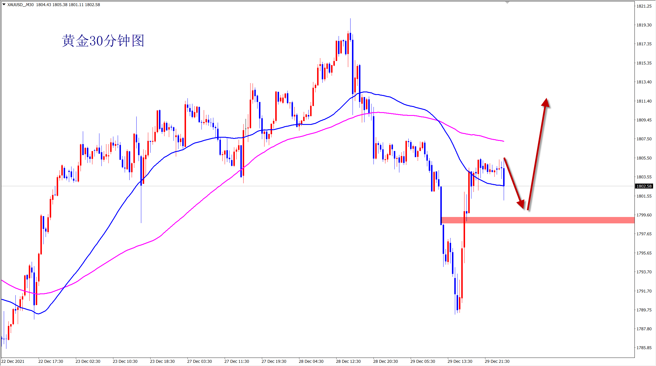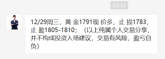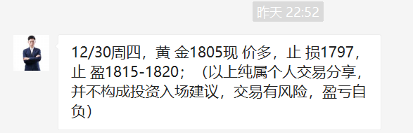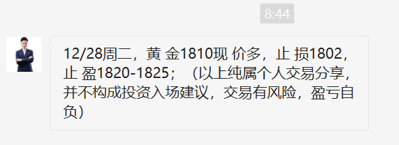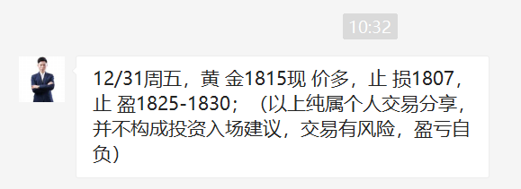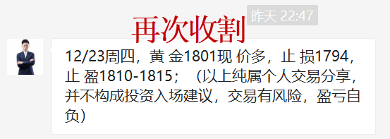 黄金自1791位置开始干多,昨日1801多,1805多再次拿下利润,直达1815位置,多单三连胜到手,今日是2021年最后一个交易日,年线收官,我们必将再创辉煌!关注王杨,准备在新的一年里续写传奇! 黄金周三日线收长下影线,昨日再次大阳拉升,很明显的阶段底部结构出现,而且是再次开启波段上涨的走势!今日将顺势继