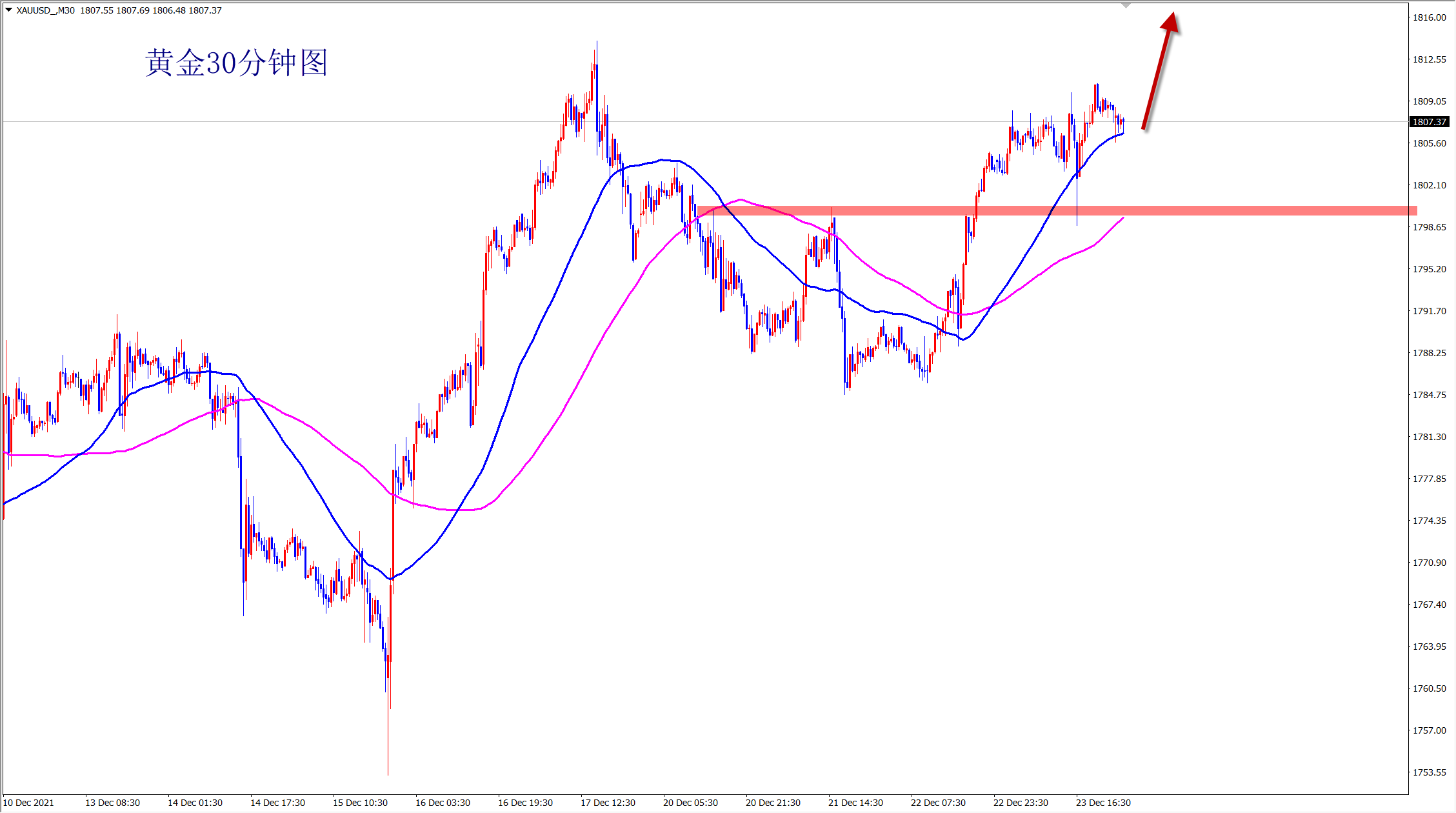 黄金当前站稳1800上方,短线虽然遇阻,但行情表现依旧强势,还是多头上涨不变,早盘依托1800支撑继续干多,行情强势,顺势跟进,突破后必是大涨! 黄金当前属于筑底后的反弹上涨段,而且站稳在1800支撑上方,突破后多空转换,压力变支撑,而且30分钟级别上黄金受到均线支撑震荡上行,非常强势!今日将依托1800的支撑
