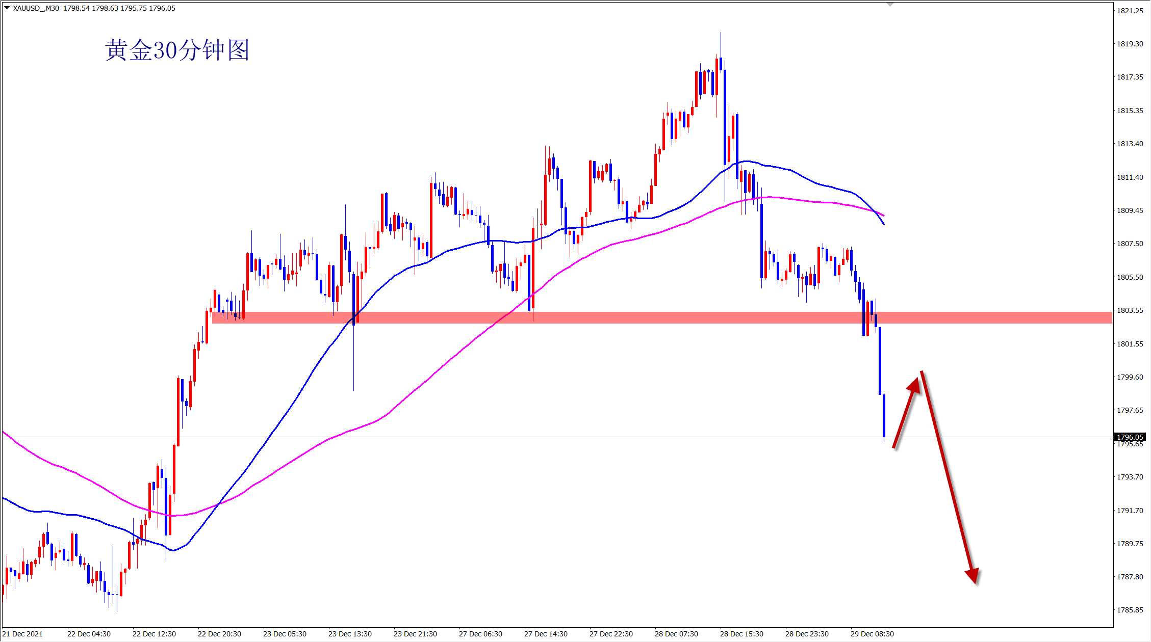 黄金今日震荡后破位1800,行情转跌,方向改变,我们也要及时的调整自己的思路,美盘依托1803压力干空了! 黄金1800是多空分水岭,破了就是破了,无需可惜,无需惆怅,要做的是及时的跟上市场的节奏!当前1803成为行情反向阻力位置,美盘我们将依托此压力位置反弹干空!从走势上看,黄金已经转为跌势! 空,美盘及