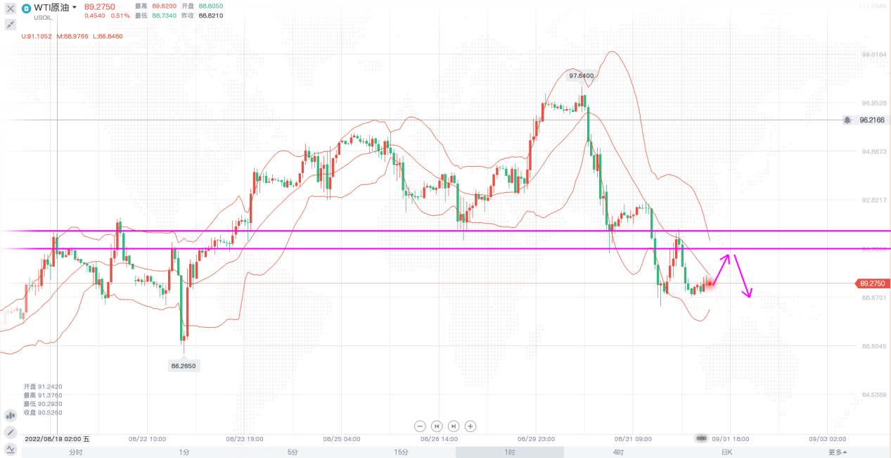 原油价格近期走势比较纠结,方向上并不是很明确,上周的反弹上破了重要的阻力,不过本周因为基本面的影响,价格再度下破90美元,跌回了低点附近。日线级别,布林带走平,价格冲高回落,连续两日阴线使得价格再度重回布林中轨下方,价格再度走弱,目前来看,还不到抄底的时候。4小时,布林带开口向下,价格横盘于下轨附近,昨日美盘虽然冲高一波,但很快回吐了涨幅,价格走势还是偏弱一点,日内操作上以反弹高空为主,而上方关注昨日美盘反弹的高点,也就是91.5美元附近阻力。