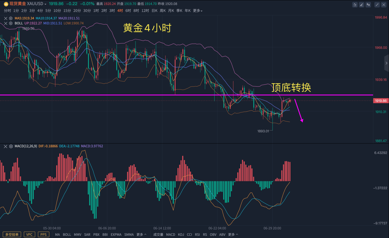 如图,金价破位1910的支撑失直奔1893美元/盎司的低点位置,上周五美盘受数据刺激,绝地反击上涨对1920附近,大阳线的拉升看似非常强势,美国通胀缓和之后,市场对于加息的预期也有所降温,这就导致了黄金出现一波反弹,但并非反转,黄金的底部我更倾向于降息的出现,而不是加息预期的降温,这完全是两回事,情绪性的变动只能带来短暂的行情波动,而实质性的降息才是推动牛市的根本。