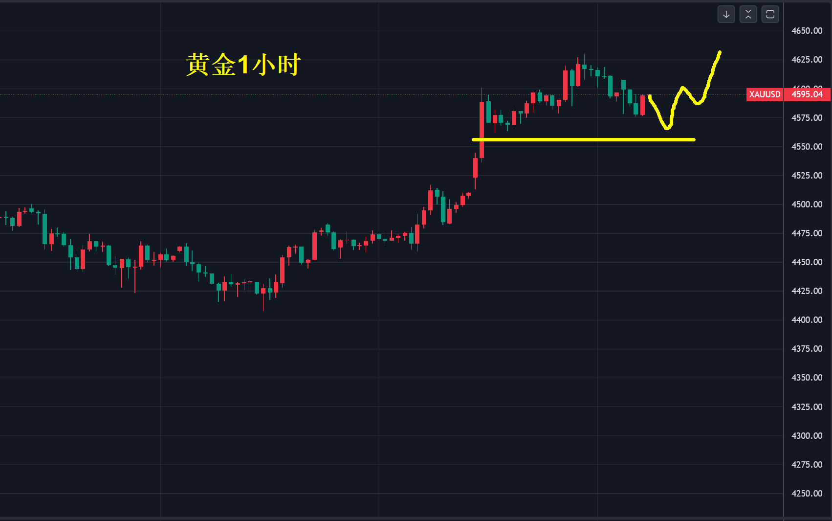 1小时黄金走势4550美元支撑继续有效,记住这里破位进入修正,不破位高位强势震荡,昨晚美盘小范围突然后没有延续,还是以高位修正为主,波段性参与没问题,在这里长线介入性价比不高,风险不是发生了才知道,而是事件做最坏打算,事后发生了不是风险而是损失。