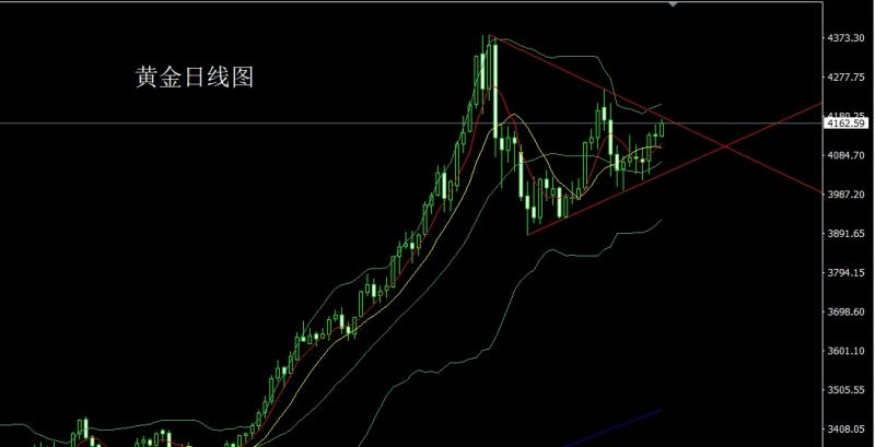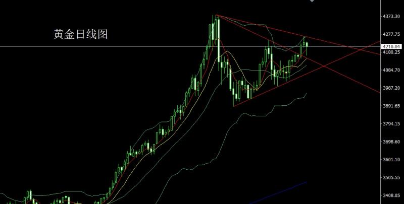 昨日黄金市场早盘开盘在4232.1的位置后行情小幅拉升给出4236.4的日线高点后行情震荡回落,美盘盘中时段日线最低给到了4162.1的位置后尾盘拉升,日线最终收线在了4210的位置后,日线以一根下影线极长的锤头形态收线,而这样的形态收尾后,日线回踩三角上轨有效拉升,今日的行情回踩延续多,但日线形成搓揉形态后行情以区