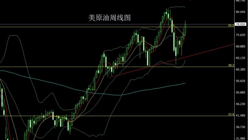 上周美原油市场周初开盘在75.598的位置后行情先回落给出74.186的位置后行情强势拉升,周线最高触及到了80.457的位置后行情触及阶段性压力获利了结,周线最终收线在了78.903的位置后,周线以一根上下影线很长的大阳线收线,而这样的形态收尾后,早盘79.6短空止损80.1下方目标看78.2和77.8跌破看77.2离场反手直接多,止损76.5,目标看81和82.