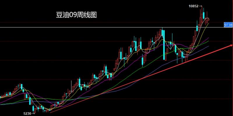 豆油09市场上周开盘在9989的位置后行情回踩9910的位置后行情强势拉升,周线最高触及到了10574的位置后行情回落,周线最终收线在了10173的位置后行情以一根上影线极长的倒锤头形态收线,而这样的形态收尾后,本周10350尝试空止损10600下方目标看9910和9820-9750.、