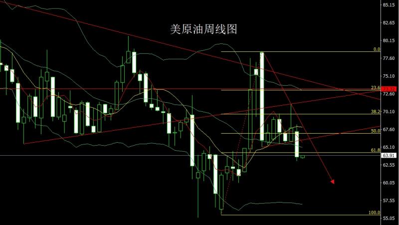 美原油市场上周低开在67.3的位置后行情先拉升回补缺口给出68.27的位置后行情强势震荡回落,周线最低给到了63.07的位置后行情整理,周线最终收线在了63.66的位置后行情以一根上影线长于下影线的大阴线收线,而这样的形态收尾后,本周先拉升65空止损65.5,目标看64和63.5和63跌破的话看62.5和62.