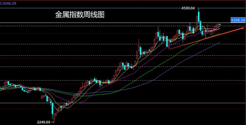 上周金属指数市场周初开盘在4148.94的位置后行情先回落给出4115.46的位置后行情强势拉升,周线最高触及到了4200.06的位置后行情冲高整理,周线最终收线在了4169.77的位置后行情以一根下影线稍长于上影线的十字星形态收线,而这样的形态收尾后,下周金属指数市场虽然有支撑,但上方压力也在增强,所以短多后空是下周金属
