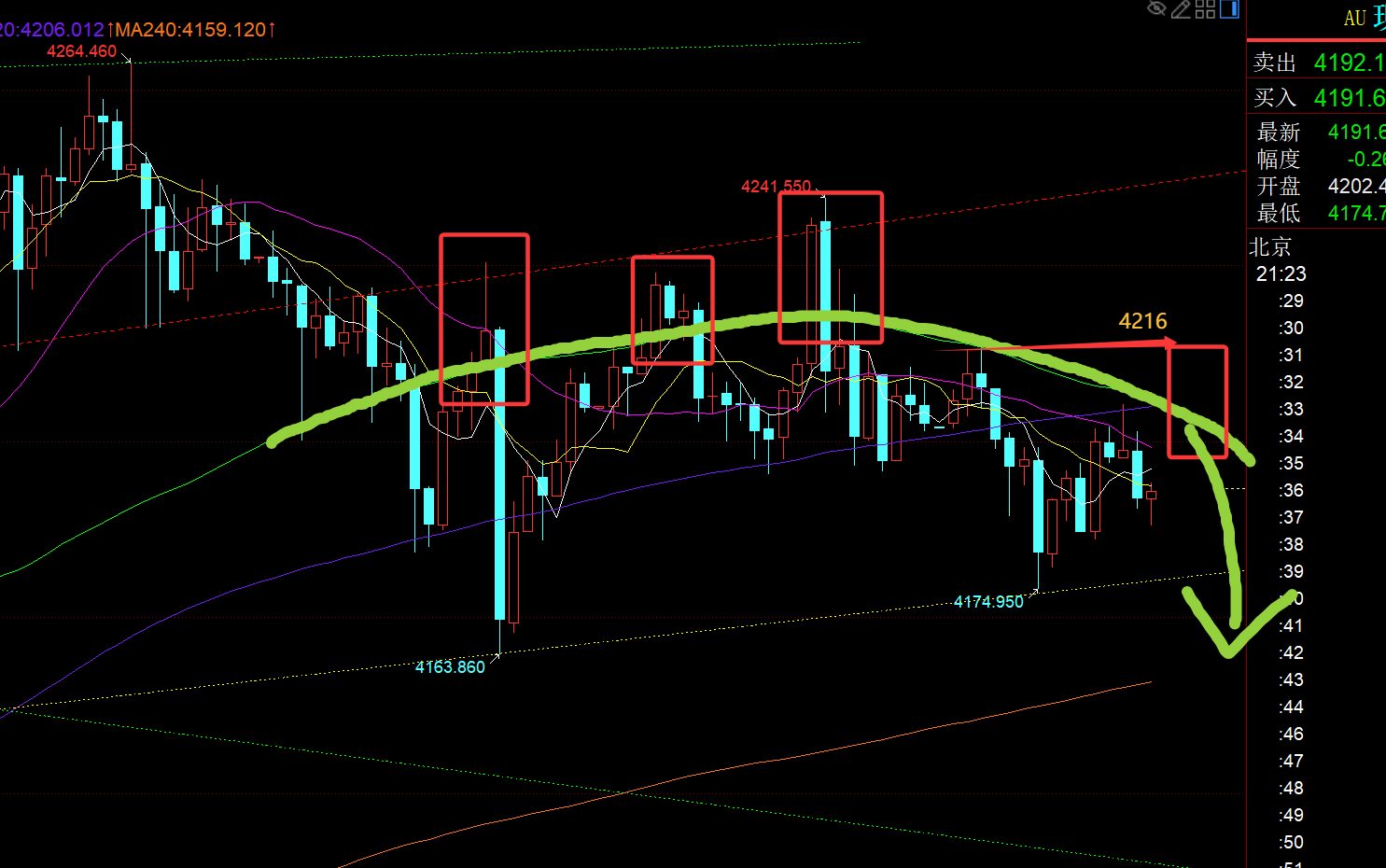 郑氏点银:黄金震荡慢跌失守4200,今晚先看二次打压 回顾昨日行情走势及出现的技术点: 第一,黄金方面:昨日差点被多空杀,节奏没把握好,主要是出现两个问题,可能是大部分人都会犯的:①,当短线有了利润,比如昨日4238震荡看涨,最高拉升4247,有了9米利润后,没及时上移保护损,最终反而