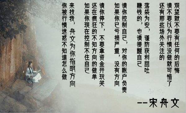 行情不大,大的是人心;波动不小,小的是胆量!舟文每天发布操作策略及现价单,单单精准到位,宋舟文实力有目共睹!舟文每天将策略无偿发布,不图什么,就想给在市场投资的朋友一个方向,操作的时候不至于那么盲目。行情每天都在不断地变化,每给出一单都是经过严谨分析,宋舟文保证的是每个单子都要获利出场,一天两天的获利可以说是运气,那一周呢?一个月呢?