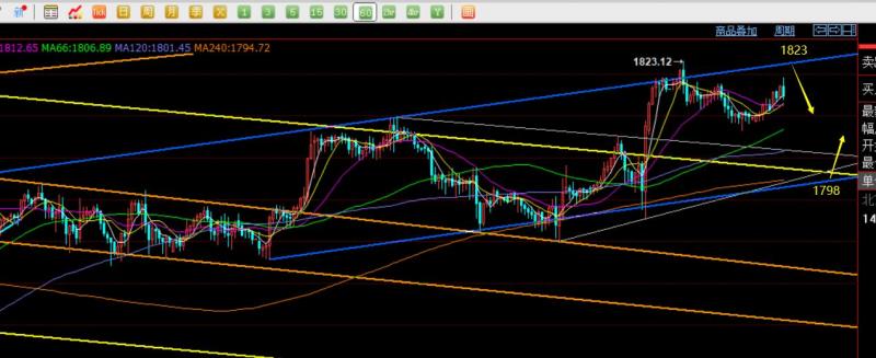 第三,黄金小时线级别,隔夜冲高回落,今日亚盘先反弹,一般来讲,一旦承压,会出现二次回落试探;如果是早盘先急跌下探一次,则日内企稳上涨力度以及高度会相对前者之大;显然,今日是直接先反弹了,虽然日线处于通道突破后的上涨,但macd也会随时出现背驰压制,另外,价格还在蓝色通道之内承压,阻力上轨上移至1823一线,也是昨日高点,建议此位置下不宜追多,适当去短空试探,下方强支撑确认点是1798,此位置上逢低多即可,还是卡此区间来运行对待;