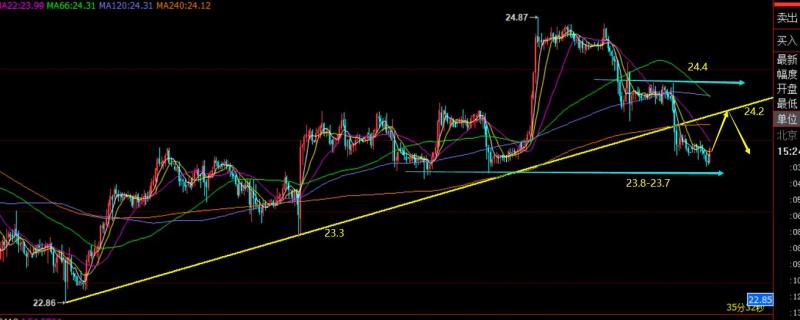 第四,白银方面,黄色趋势线破位,反抽确认压制仍可参与空,因此思路明确,反弹24.2下压制短空,下方支撑关注23.8和23.3,昨日横盘高点作为一定防守即可;
