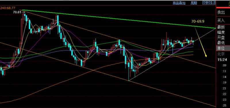 原油方面:昨日日线收阳,那么从形态规律上看,似乎是单阳三阴模式,且看今日收线情况,若转阴,那么接下来会连阴循环可能;从趋势通道看,强压点已经下移70-69.9一线,只要不突破站上,其下方依然坚守高空为主,短期支撑69.3一线,从短周期15分看,存在顶背驰,拉高容易回测,只要等小时线大阴出现,且收盘于69.3下方,可69.5下可再尝试空,看68.8的破位,防守70上方就行;
