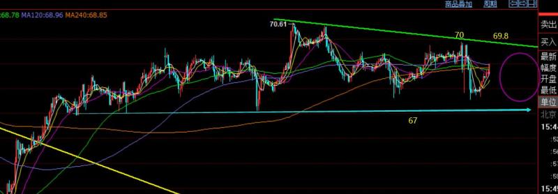 对于今日来讲,隔夜持续走跌,凌晨低位弱势横盘,今日早盘续跌失败,探底拉升,那么日内先走一波修正再看压制回落,参考最后大阴顶端阻力68.7一线,同时也是隔夜跌幅50%分割阻力去布局短空,但此时又遇到了延续性差的问题,大跌后又似乎开始连阳爬升,往上关注69和69.5两个压力点,通道阻力下移至69.8一线,若价格突破69了,建议能回测68.7就考虑调仓出,免得又是上下来回跑,然后晚间69.8下再依托通道阻力去狙击一次空即可;不管如何,原油只要通道阻力一直承压不上,拉高都是尝试高空为主,若上破通道了则举手投降,那么下周就考虑去反手跟多;