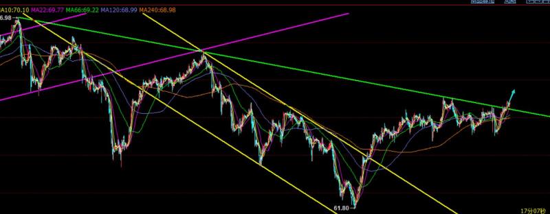 本周就需要重新解读规划:第一,当前短线上,趋势通道阻力既然上破了,走势就转为偏多运行,而这个上破是否是一种诱多表现,还是真的突破走多头了,就需要本周初的走势来定夺,走一步看;第二,月线和周线大周期来讲,总体上还是维持多头趋势,但8小时级别,短周期来讲,仍处于顶背驰的状态,拉高容易回测,那么它是否会存在前期一样的循环呢: 走震荡逼空抗跌一路慢爬上行,然后再砸下来; 此时操作上不好下手,关注通道的回测支撑69.6,只要处于此位置上方运行,则偏多为主看待,重新打回下降通道内,再去考虑转弱做空; 阻力70.5和71.2,支撑69.6-69.5,区间内运行对待,周一可以多观察为主;