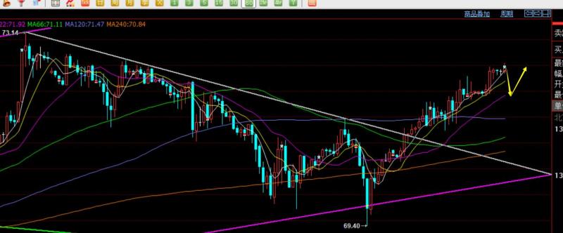 原油方面:昨日价格突破下降阻力线后,同时破位前一日71.4高点,指出回踩71上逢低多,看72目标,思路正确,目标到位,只是最低71.2,离预期进场点差0.2左右;对于今日来讲,小时线级别有再次逼空摸高的迹象,保持短线看涨,预计还会试探73前高,甚至周线双顶74或触及再承压反转看下滑;作为逼空行情的展开,耐心等回踩早盘起涨点是继续做多时机,即72-71.9触及多,看73逢高一线;