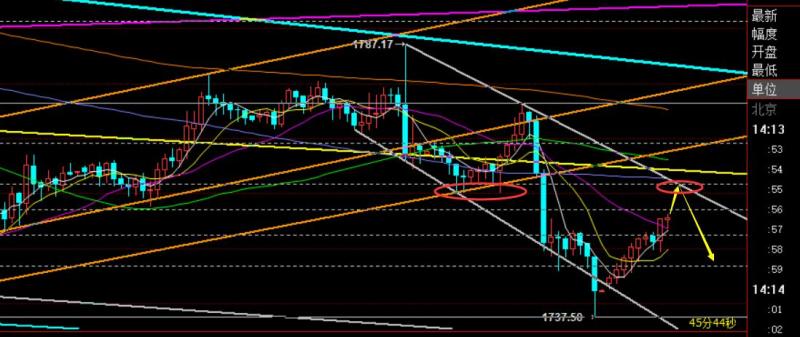 第三,黄金小时线级别,隔夜从1776一路跌至1738低点,作为隔夜大跌走弱,第二日选择的对待方式已经讲过多次,早间开盘先直接反弹,午后或欧盘期间压制要空一次,由于日线判断走势并未极弱,做空点也不能采用隔夜跌幅382分割位置,需至少上移50甚至618阻力下,那么就是关注1757和1761两处,同时参考白色下滑通道上轨,承压点逐步下移1760-61,综合来讲,1760附近做空作为合理,也刚好是顶底转换位置,当然也可以分批去布局,1757、1760-61以此空;下方1746-47至少应该还会测试确认的;