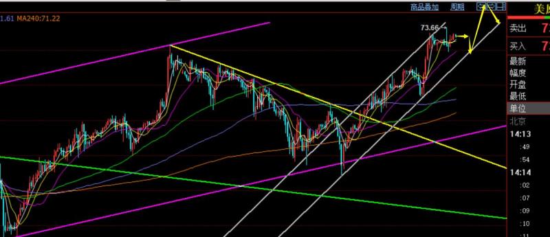 原油方面:昨日符合判断,一逼空上涨来对待,提前早已挂单72多,美盘前才给到,美盘后顺利一波拉升,突破73关口获利; 今日来讲,短线还有进一步拉升空间,支撑关注上行通道下轨位置72.7上继续多,阻力预计要测试周线双顶点74一线,此处若压制再考虑做空;