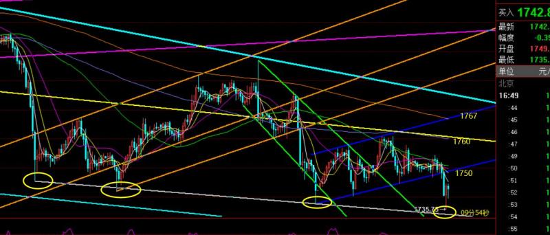 第三,黄金小时线级别,昨日围绕如图新的蓝色通道内上下运行,凌晨后冲高压制,早间10点续跌失败,触及下轨1747支撑刚好反弹,只是力度不大,未能给到1760高空的机会;欧盘再一次试探下轨48一线就有些不妙了,提示早间多保本一线出,但并未急于反手空,主要还是担心它反复而导致入场点卡中间的被动情况出现;那么提前给学员挂1735一线多,主要两个原因:一是前期低点1745、1738连接的趋势衍生支撑点正是35附近,二是当价格破位前期低点,会形成底背驰而带动反抽拉升;触及1735后,很快试探了1745,快速拿下一波利润,接下来美盘预计会试探蓝色通道下轨反压点1750附近,若这里继续突破,会延续反弹上攻,日线则收中阳,进行大阴之后的反复整理,个人认为1735处支撑还是偏强的,下方空间不大,倾向于35上方低多为主,60下压制空,甚至67-68下压制空更稳妥;