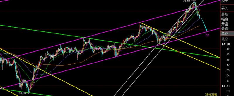 第三,黄金小时线级别,隔夜冲高回落,今日就是等待10点前后的续跌表现,发现无力下滑,且小时线macd金叉放量,果断通知学员1735-34继续做多,1741目标顺利拿下;当前如图通道显示,1744处于红色线承压,刚好也是隔夜开跌口,此处压力得失很重要,若突破,基本可以冲击1750-1760;反之,压制底部还会反复磨一下,白色趋势线在1732,隔夜1728低点都存在一定支撑,另外1736处于前两个小时低点,也有一定支撑,由于macd红柱已然放量,即便价格下滑,也容易背驰拉升,因此操作上,倾向于拉低多为主,看好1744迟早会突破而扩大反弹力度;主要个人认为美债小时线级别,顶背驰太严重了,随时会跳水杀跌,这是黄金隐藏拉升的最大隐患;那么讲完做多思路,哪里做空好呢,可以关注黄色和蓝色趋势线的重合点1760-1758附近,触及这可以再高空下来,因为日线当前还是处于压制偏弱的,能拉高就要尝试高空;