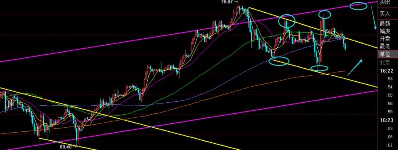原油方面:昨日可以说是一副好牌被自己打坏,原本早间思路是75.2下继续看跌至73,见白盘多次支撑74.5不下,欧盘又反弹突破了早间75.2高点,担心它上冲76紫色通道阻力再下来,就提示75.2原点位附近调仓出空,结果75.4受阻就掉头转跌至73.1,基本符合了早间原本该有的走势,而75.4恰好又是黄色通道上轨承压位置,未能先发觉这一通道而离场手中空,着实有些不甘;那么当欧盘连跌向下走弱,有效破位74.5支撑后,美盘建议反弹74.5顶底位置尝试空,不料也发生了意外,突袭一波急拉冲击76又掉下来,扫盘狠狠的被打脸,最可笑的是高点76美元,是原本欧盘突破75.2后,认为可能会试探的阻力点,打算上移此位置再去空,都被先后捣乱了顺序;