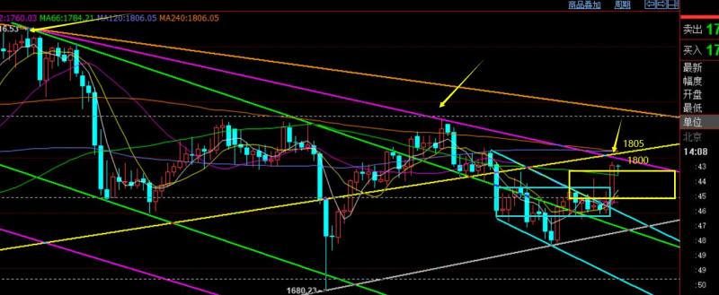 第一,黄金日线级别,昨日大阳形态出现,前期1746-1764之间的震荡基本彻底走出,但个人认为,仍旧不太会出现单边持续的上涨,大概率还是回归震荡,只是区间已经上移,预计1760-1800之间得运行几日;从1916-1835形成的趋势线压制以及19年以来的趋势线反压,可以看出1800及上方压力将会非常大,按照原先的思路规划,1800上下有概率会出现再次的压制下滑,甚至砸盘;昨日的一波猛冲,今日一旦无法较好的续涨,持仓的多头或陆续展开获利盘的抛售;因此,短期重点关注1800及上方承压信号,结合年均线以及分割压力,1805处压力或1800-1805是具备打压的;