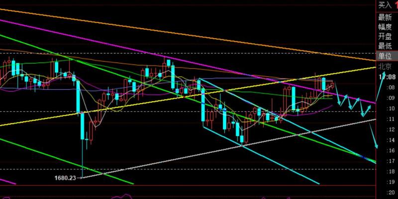 第三,黄金小时线级别,隔夜探底拉升,早间先试探凌晨低点1793-94没有下破,不过当时9点收线已经失守了10均线下方,且处于1813.5-1810这几天高点所连接的通道阻力下,认为1800下会有所压制,进行隔夜拉升的回踩修正,但价格并未下行,而是上破趋势通道,试探了周二其中一个1804开跌口,此时的价格就显得有所揪心了;一方面,通道阻力线突破,暂时抗跌运行;而另一个方面,1804-1810压力又是密集区,半小时顶背驰状态出现,多次反弹又容易压制回落;综合来看,结合日线分析,认为1804-1810压力会承压,来一波下跌,短期支撑关注1798-97.一旦这里破位失守,那么1793起涨点日内风水岭也应该挡不住,会逐步试探1786一线;若1810突破强攻上行了,那么则观望看延续力度以及日线的站稳情况再进一步的分析;
