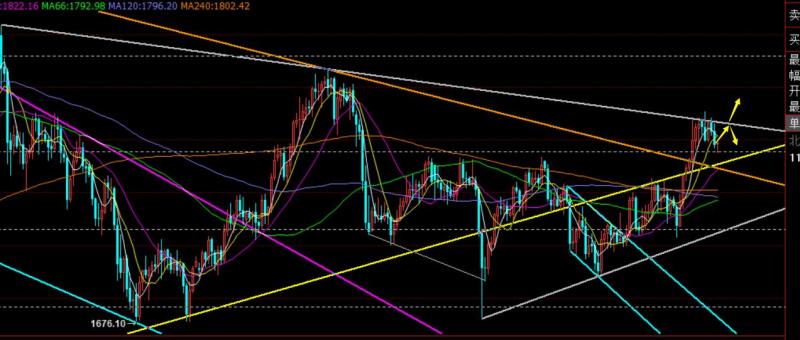 第二,黄金中期周线级别,连阳上涨后,上周收阴回测,不过价格还处于两前期通道之上,且5均线开口逐步远于10均线,一定程度上暗示1830上存在中期支撑;