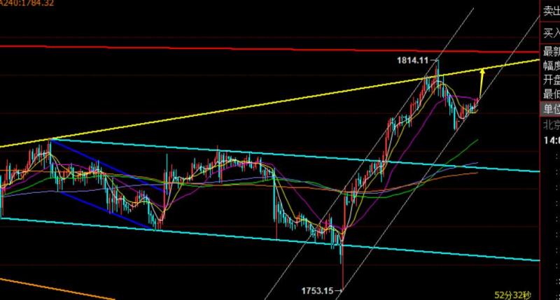 第四,黄金小时线级别,图中从预期通道来看,上周五回调的低位1796一线是打到了下轨支撑,今日早盘震荡缓慢反弹,配合macd空头动能的缩减,预料会依托此通道下轨得到支撑后上冲,短期压力是中轨1803-04,站上后看黄色通道1810-11再次确认;只要维持上涨通道内发展,整体的短期反弹势头不改变,并且也随时可能再次走逼空拉升;