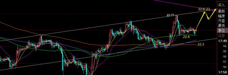 第四,白银方面,它的走势这两天明显比黄金强很多了,不仅突破了上周五高点,支撑也逐步上移中,今日早盘提示22.4上逢低继续看上行反弹,现在已开始再度拉升中,阻力22.8-23一线关注下;