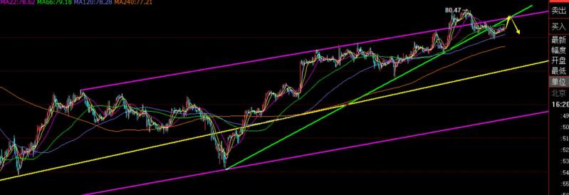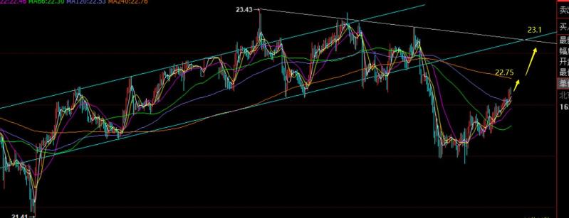 第四,白银方面,也是如期震荡一路反弹,即将试探日线昨日所讲的紫色通道反压点22.75一线,此位置刚好也是小时线年均线共振点,突破站上此处,则有望冲击图中趋势压力交叉点23.1一线,支撑则关注中轨以及白色短期趋势支撑点22.4-22.45逢低位置,触及仍继续多为主;