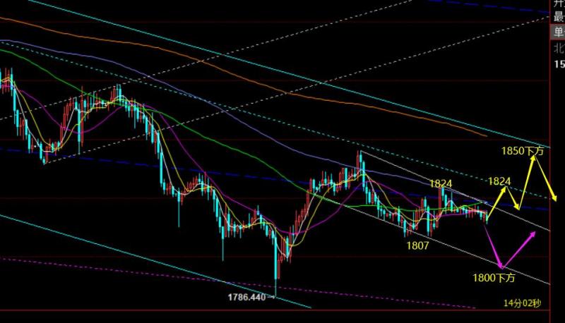 操作上,可先以1807作为防守,去直接做多试探,若能守住1807,反弹上行就应该会试探1824,甚至上破; 反之,若失守1807,就关注1800及下方企稳信号;