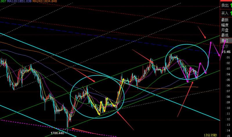 黄金短线关注1842双底支撑,守住此位置则上行修正反弹通道暂时不变,压力1850,欧盘若能突破站上,则会延续反弹冲击早间高点1856,而618分割压力1859-1860处有一定压制回测作用,可参考图中两个圈圈部分的循环推演;