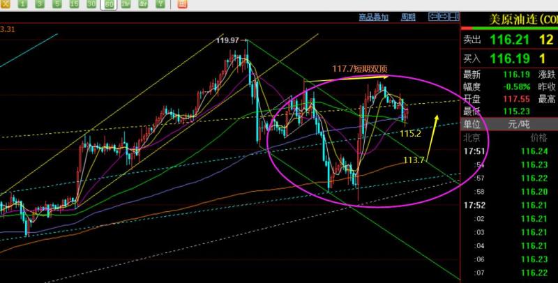 原油方面,昨日和金银一样,逼空强行拉升一波,再一次试探117.7形成短期双顶承压,今日早盘压制117跌至115.2,此位置属于昨日涨幅回调382分割位置,现在要关注115.2-117上下得失,若先突破117上去,则回调结束,又有冲击120的动能;反之,失守115.2向下,则回调延续,指向113.7,它是618分割位置,也是昨日下跌通道破位的回踩确认点,做多参考点,这里若继续失守,就是大幅来回洗盘了,又会指向112-111;对于波动率放大的原油来讲,什么都有可能,做好风控第一;