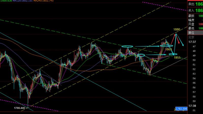 黄金分析:昨日在短周期macd顶背驰下仍继续拉升,则转为震荡逼空上行,强行扭转背驰作用,而这一般是短期内的,最终会带来一波跳水来修复;由于隔夜持续上涨,今日早盘承压1874通道反压后,先进行震荡回踩,整个欧盘期间到现在无法站上隔夜高点而走强延续,则晚间大概率是一个震荡过程;不过,按照昨日ADP小非农公布看,今晚大非农也偏向利多,预计上冲一波后进行打压回测,回归日线级别大区间内震荡慢上行发展;那么首要参考做多点,则是昨日涨幅回踩382分割位置1863-62,作为短期走强,第二日这里要先试探下,看能否刺破隔夜高点; 其次,回踩618分割位置1855一线也是做多参考点,也是通道突破的确认回踩点,这两个位置同时属于前面的顶底转换点;阻力则关注1874,以及1880,由于欧盘不发力,晚间非农即便利多上冲预计也难以持续上拉,容易冲高回落,那么1880上下承压可以计划高空,届时macd又会形成新一轮的顶背驰;