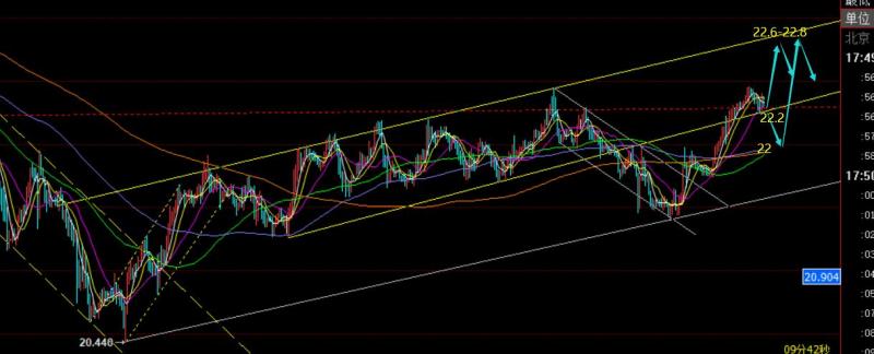 白银方面,昨日也是震荡逼空拉升,站上22.2后冲击22.45一线,今日回踩关注22.2和22两处支撑,逢低先跟多,而阻力则是22.6-22.8,冲击这里预计会承压回落,区间内还会反复运行,只是会逐步慢慢上移;