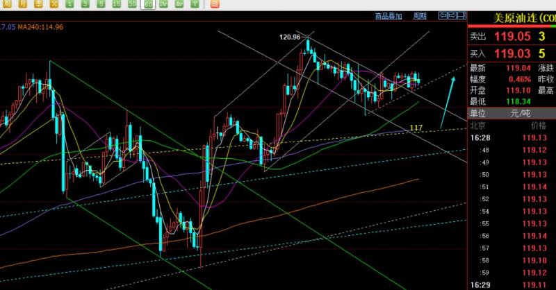 原油方面:昨日标题明确给出117.8支撑逢低多,刚好卡在了日内回调的低点,最高拉升有200点利润空间;从日线均线系统和突破前期通道上轨来看,短期内还处于逼空偏强格局,处于117上方运行,还是建议回测多为主来安排;而由于短期指标需要一个调整空间,当价格拉高刷近期高点后,不建议盲目追涨,容易出现逼空结束后一波跳水快速修正,然后再企稳上攻;