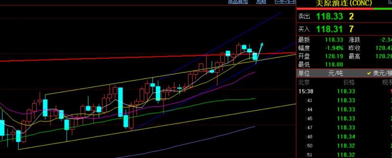 原油方面:周线维持5均线上运行,连阳后上周收报一根小十字K,中期仍偏强运行中,关注5均线支撑117一线逢低看涨为主; 日线要关注的是第二上行通道(蓝色)下轨支撑,也是117一线;另外关注前期第一上行通道(黄色)上轨回踩点118逢低支撑;虽然短线有所冲高回落,但当前通道仍向上发展,操作上回踩依然尝试多;除非117日线级别有效大阴破位失守,则逼空格局才会可能终结,届时再改变思路,去反弹逢高空;
